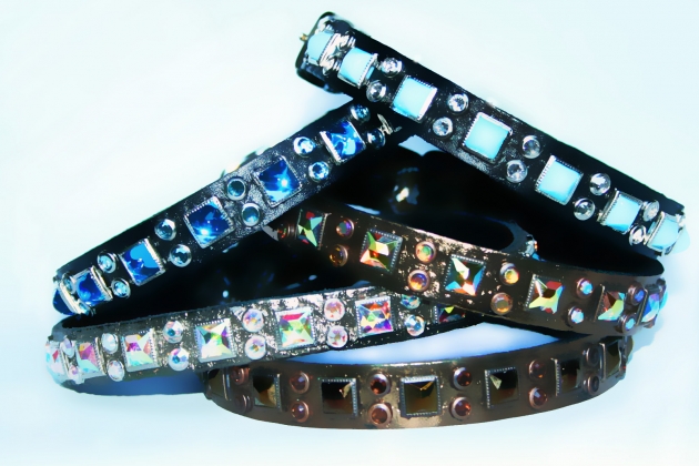 Black Leather w/ Light Turquoise Pyramid Cabs & Clear Swarovski Crystal accents, Black Leather w/ Aquamarine Pyramid Cabs & Aquamarine Swarovski Crystal accents, Bronze Leather w/ AB Crystals, Silver Leather w/AB Crystals and AB accents, Bronze Leather w/ Tobacco Crystals and Smoked Topaz accents.