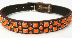 MEDINA Style with Amber Pyramid European Glass Cabochons and Pyramid Gold Studs and Ball Studs on Brown Leather. Available in sizes 10 through 26. Giant sizes available upon request. Smaller sizes have tapered end and small buckle.
