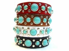 Red Leather, Chestnut Leather, Pebble White Leather & Black Leather w/ Turquoise European Glass Cabochons and Stud accents.