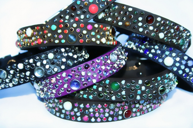 JEAN Collar Black Leather with Multi-Cabs. EARTH MIX, BLUE MIX, BLACK MIX, GREEN MIX and  PINK MIX shown above.