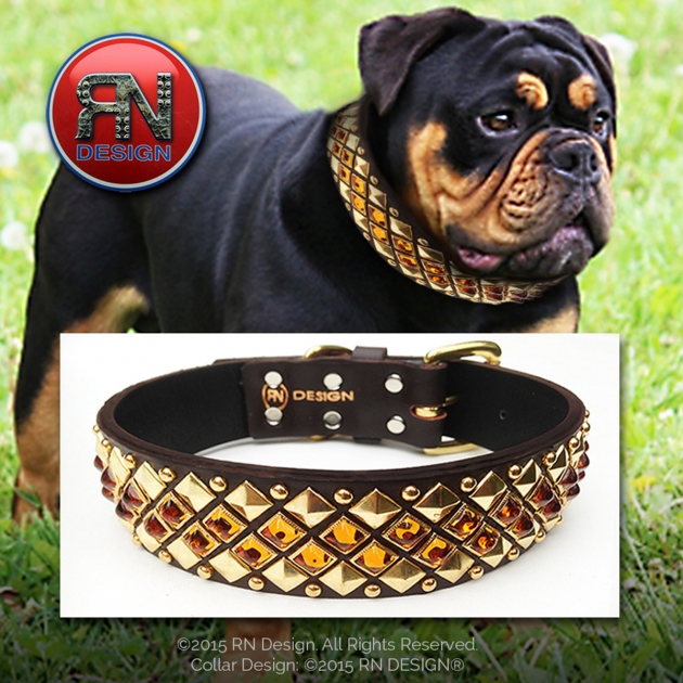 MEDINA Style with Amber Pyramid European Glass Cabochons and Pyramid Gold Studs and Ball Studs on Brown Leather. Available in sizes 10 through 26. Giant sizes available upon request. Smaller sizes have tapered end and small buckle.